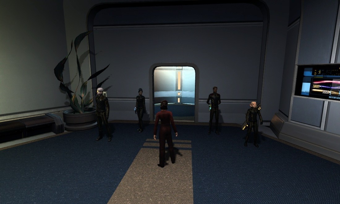 The new bridge crew of the Pioneer. Captain Nyco, the holographic Thion, the Cardassian science officer Linesa Ghemor (grandniece of Tekeny), the Bajoran first officer and Nyco’s best friend Jalyr Sol, and the Ferengi engineer Firing (it was his default name ok, I had to keep it).