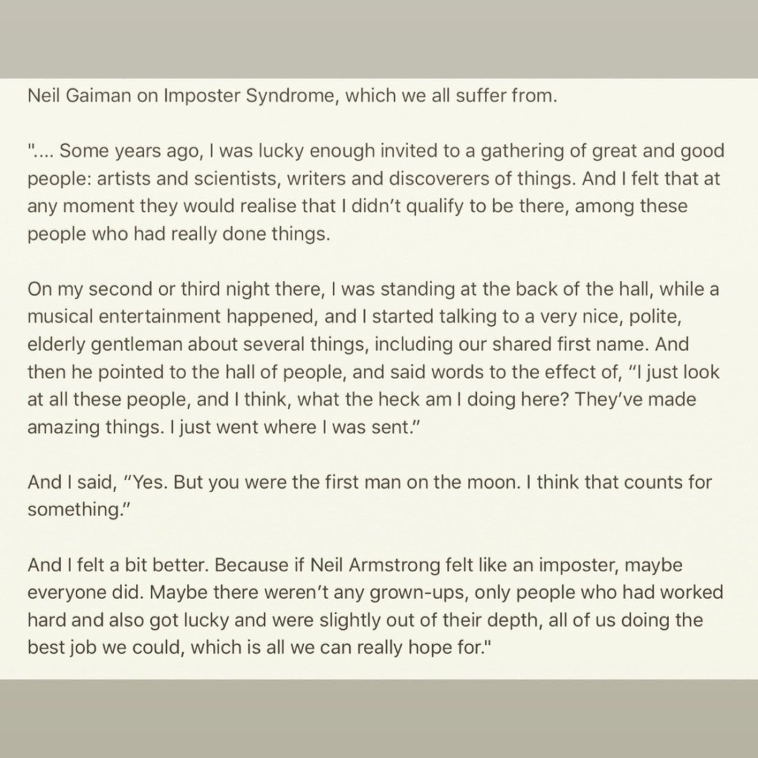 aniseeker Uncategorized May 11, 2018December 19, 2018 1 Minute lagonegirl: Neil Gaiman on impostor syndrome. Share this: Share on X (Opens in new window) X Share on Facebook (Opens in new window) Facebook Like Loading... Related Published by aniseeker View all posts by aniseeker Published May 11, 2018December 19, 2018