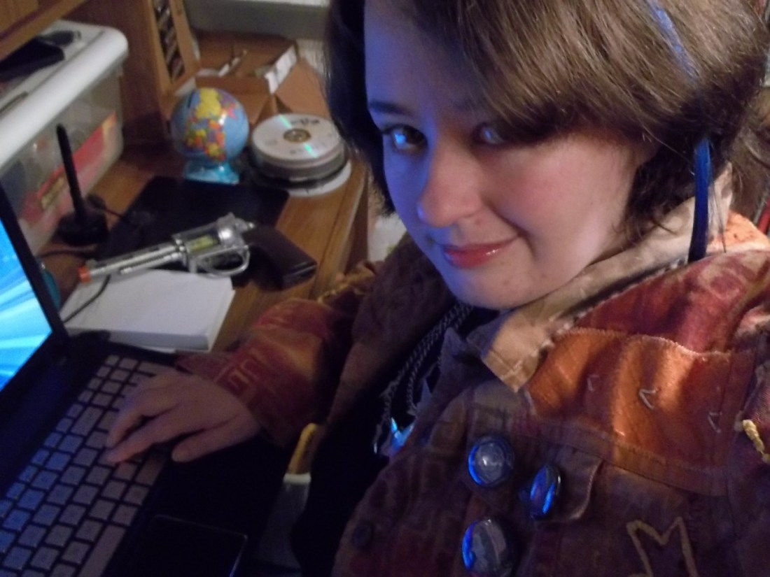 A blurry photo of testing out the circle button (so that the shoulder cloak can be removed) and also the flash/glow effect.